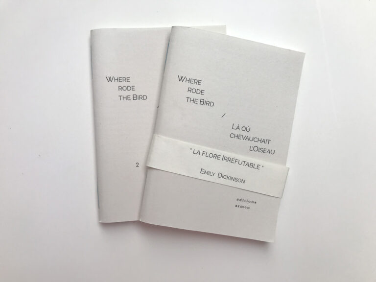 Deux recueils de Emily Dickinson dans une traduction originale de Nicolas Millet, aux éditions atmen. Deux volumes de 80 & 76 pages, format in quarto, avec fac-similés des manuscrits et d’une lettre de 1872.