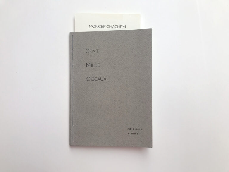 Recueil de Moncef Ghachem, poète tunisien contemporain, publié aux éditions atmen : 72 pages, format 10 x 15 cm. Ouvrage non massicoté & non paginé. Chaque exemplaire est numéroté, façonné & relié main.