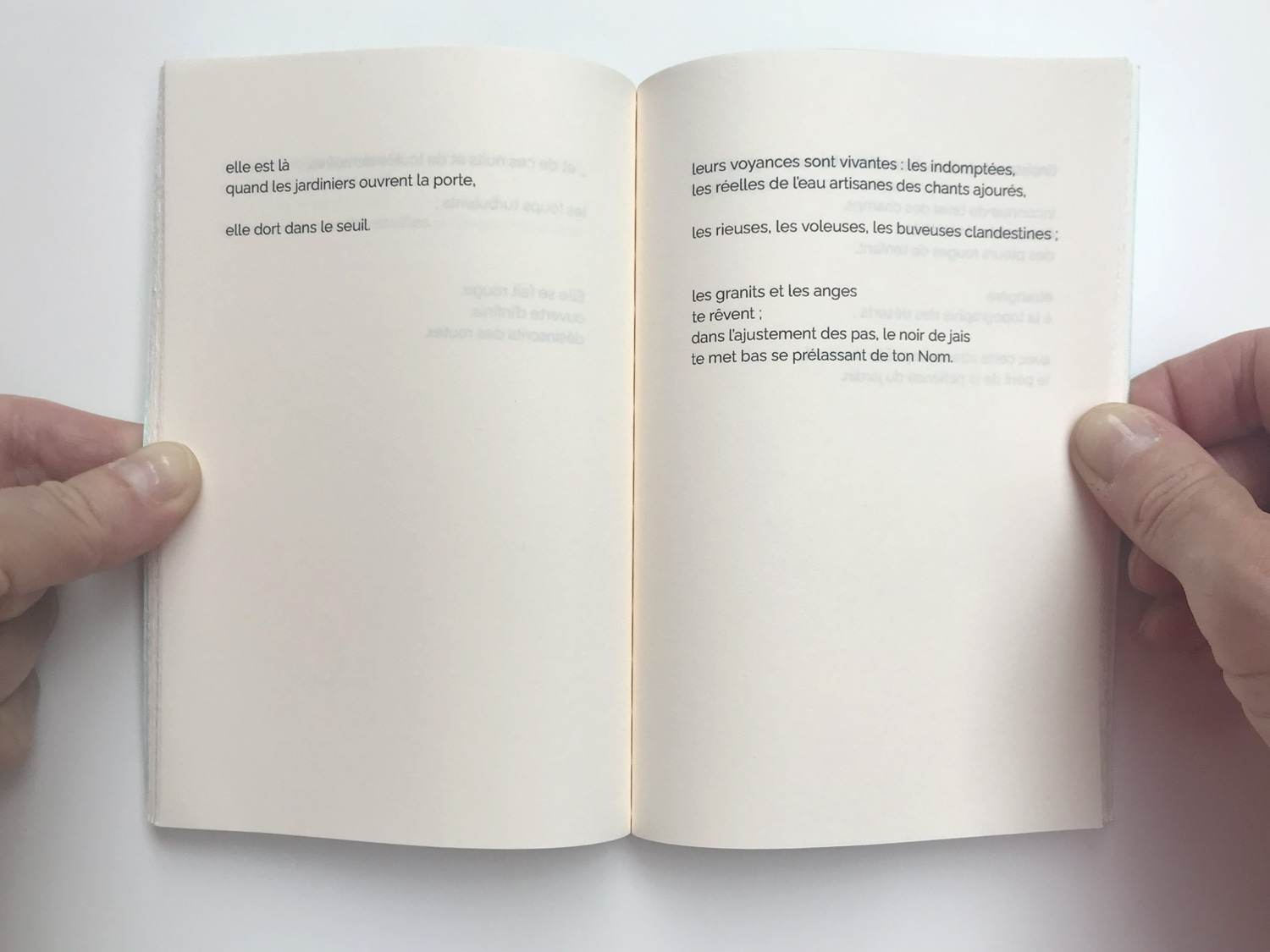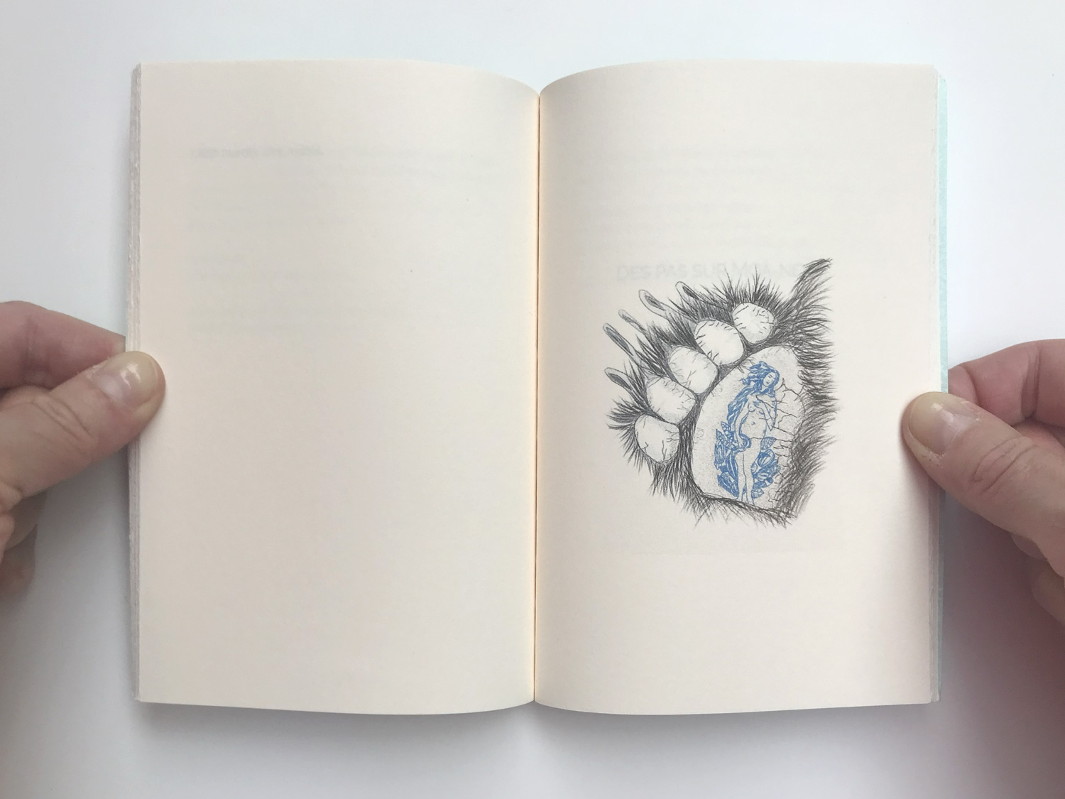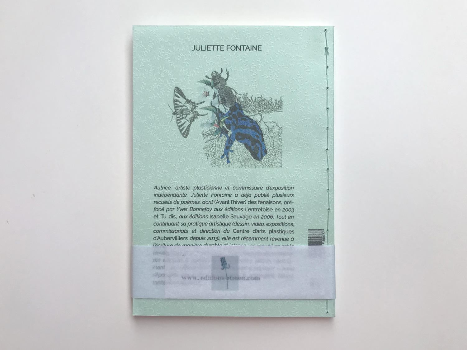 Ouvrage publié par les éditions atmen et diffusé par Pandore Éditions. 56 pages, format in quarto : environ 10 cm sur 15, de la taille d’une main. Ouvrage non massicoté & non paginé. Chaque exemplaire est numéroté, façonné & relié main. Premier tirage de 200 exemplaires. Papier japonais 116 g/m2 花 (hana) eau pour la couverture, SENDme Wove 100 g/m2 vélin ivoire pour les pages intérieures.