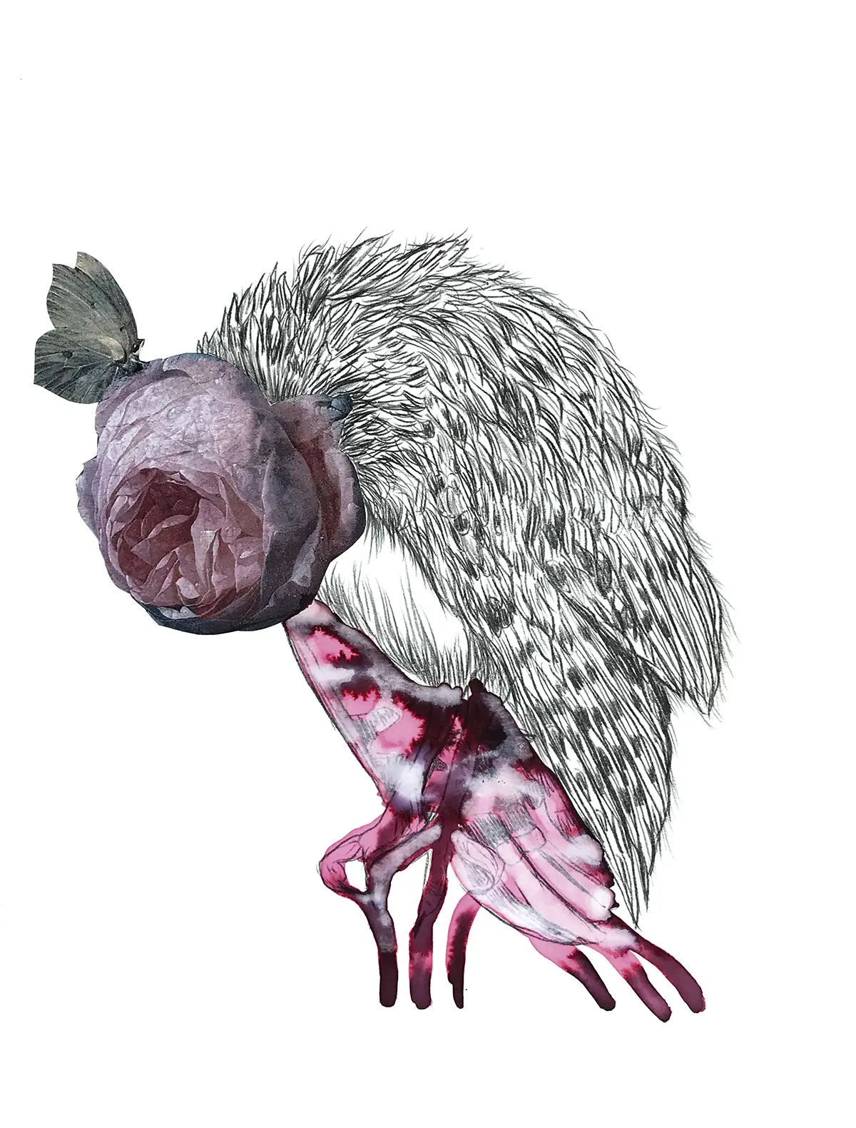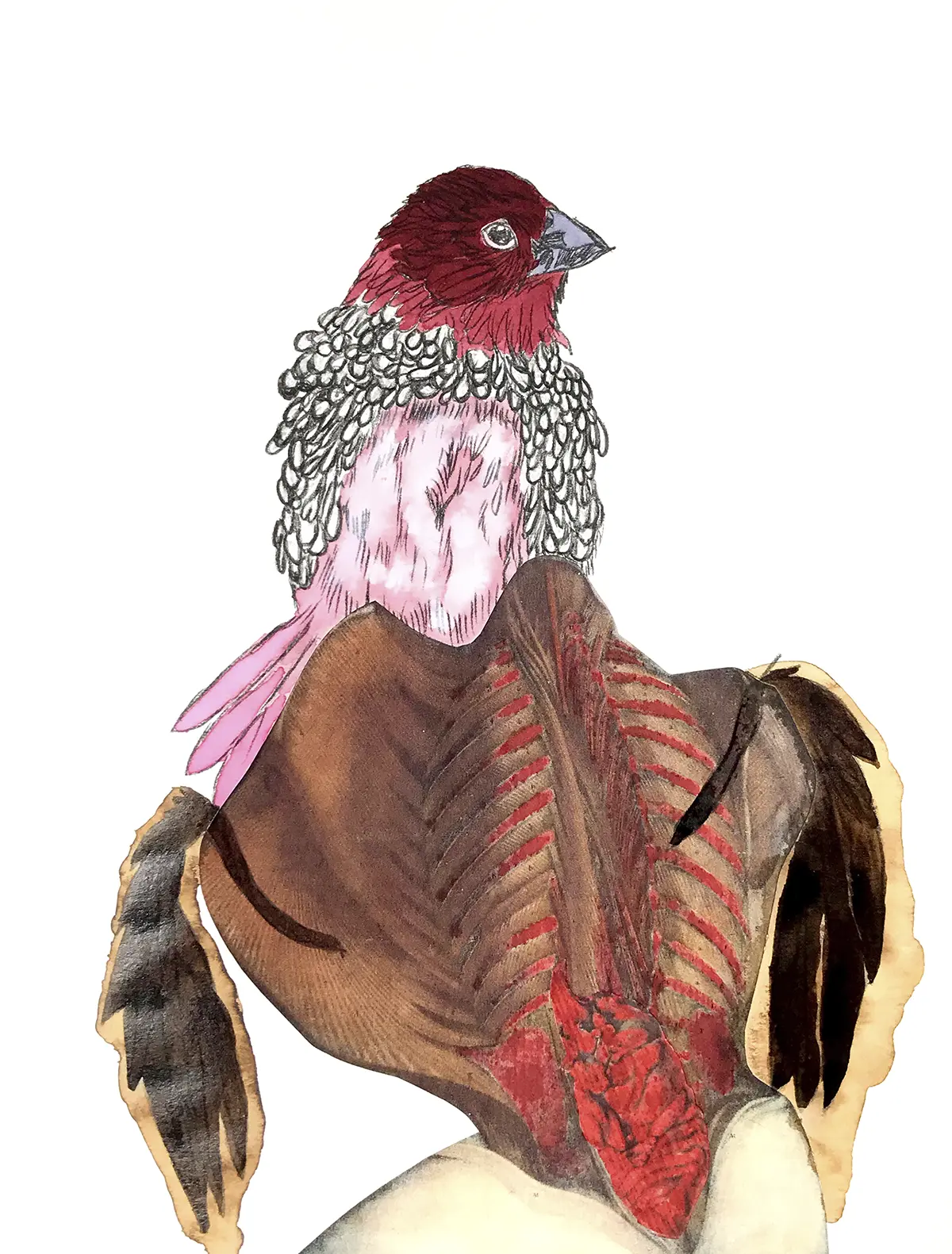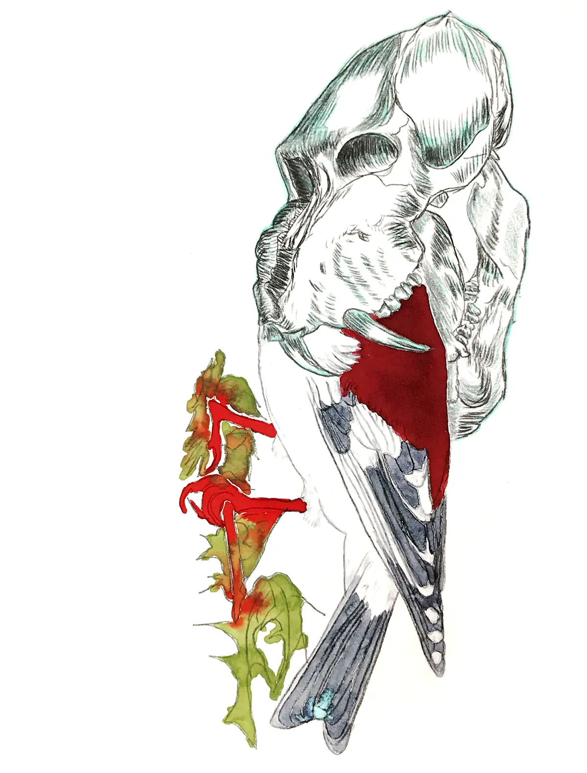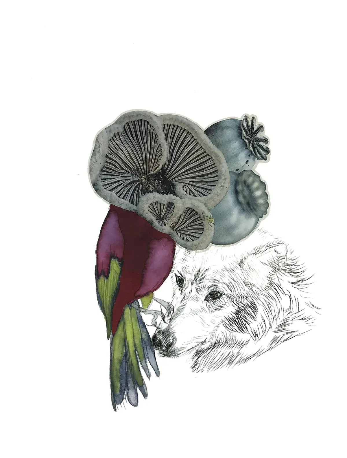 Issue d’un grand carnet de dessins créé en 2022, cette série aborde notamment un regard antispéciste de l’homme sur l’animal, ainsi que la singularité et la fragilité de leur coexistence. Elle mélange les genres et les techniques, entre vanité, planche d’étude botanique, zoologique ou anatomique, et dessin naturaliste, entrelaçant différents règnes du vivant. Les techniques sont multiples : collage, aquarelle, encre, feutre, crayon aquarellable, gravure et mine de plomb.