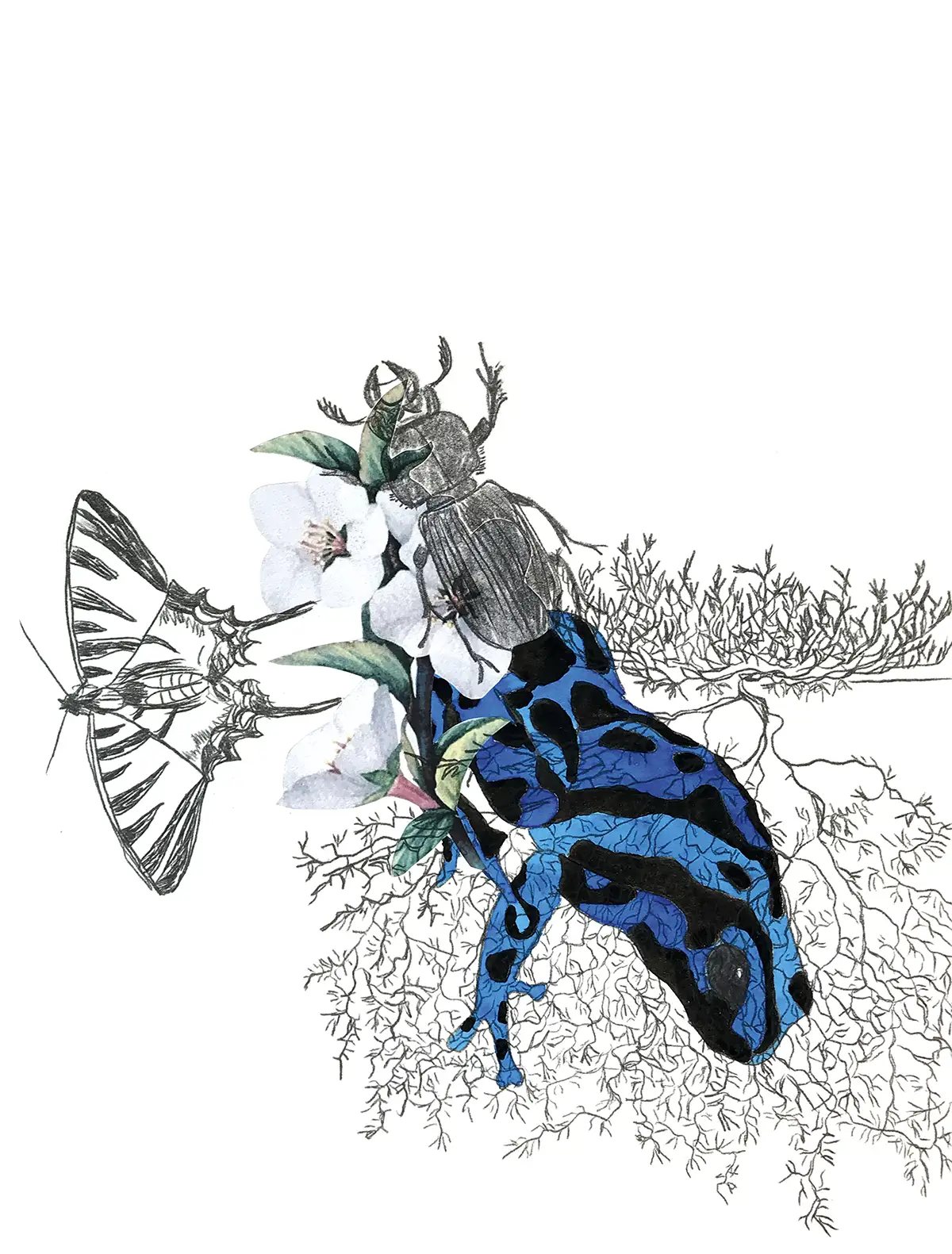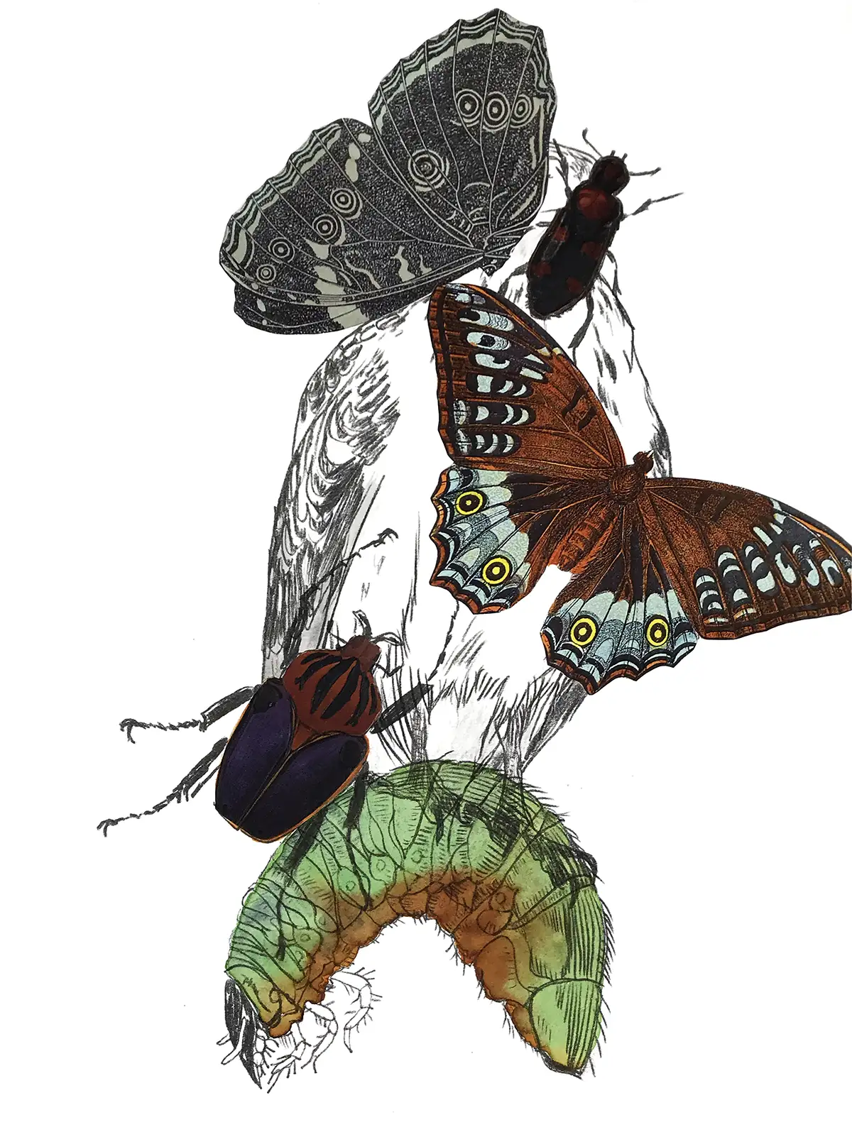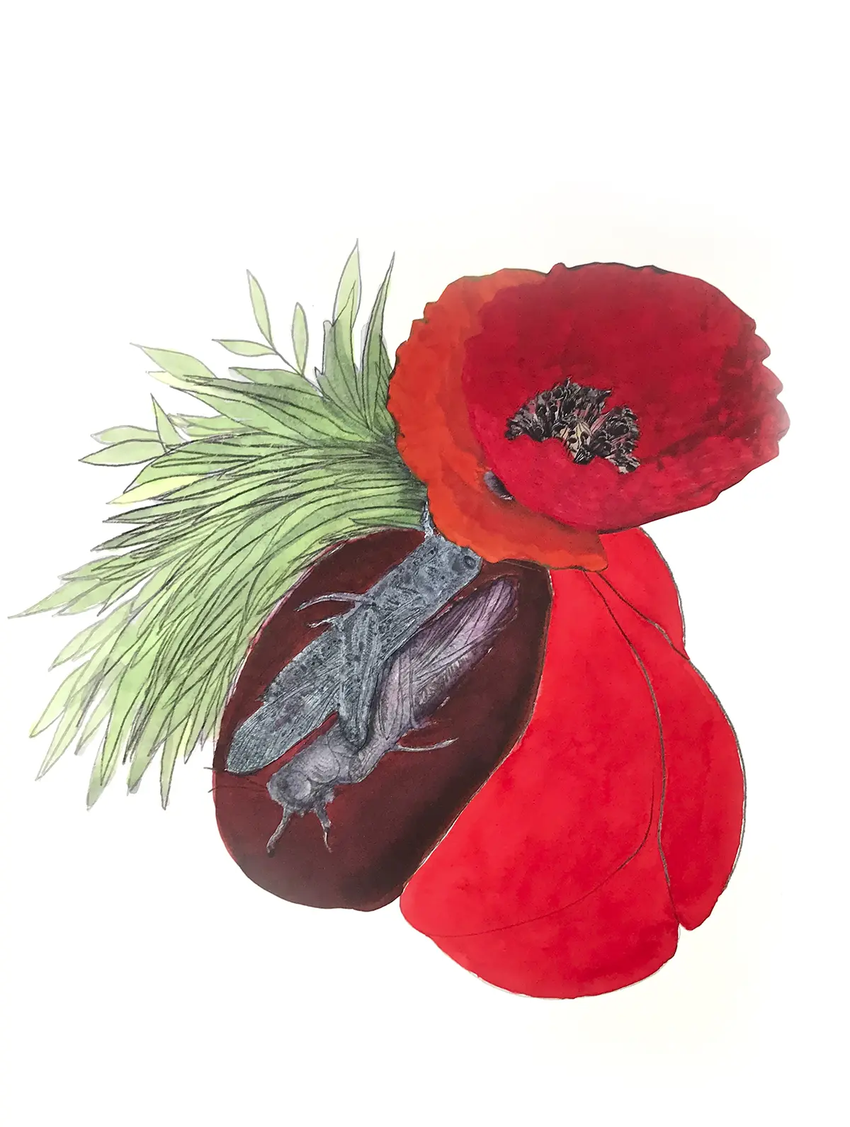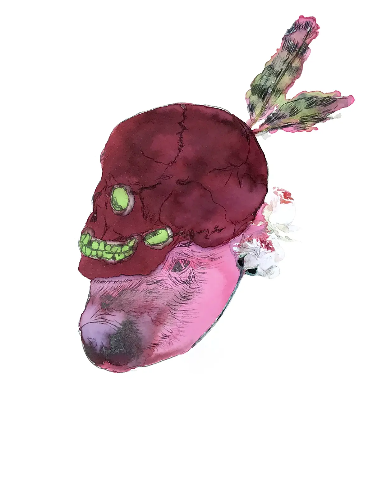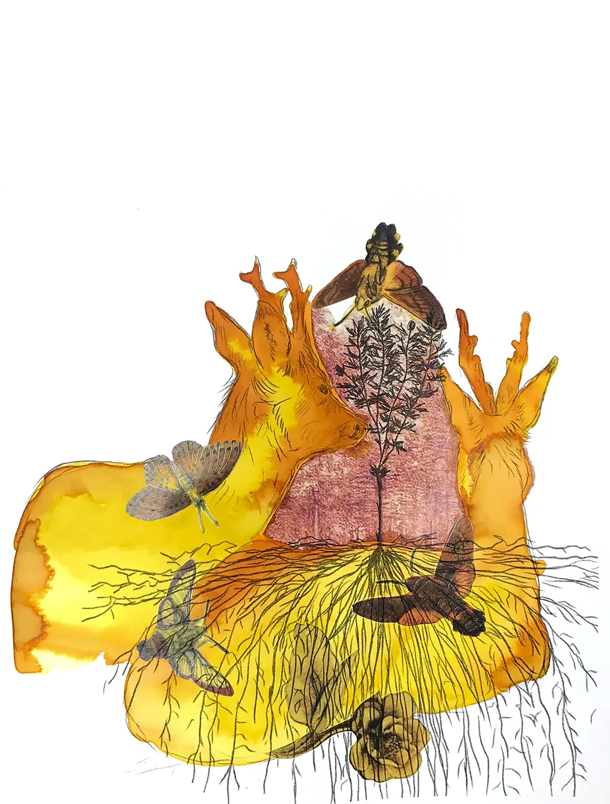 Issue d’un grand carnet de dessins créé en 2022, cette série aborde notamment un regard antispéciste de l’homme sur l’animal, ainsi que la singularité et la fragilité de leur coexistence. Elle mélange les genres et les techniques, entre vanité, planche d’étude botanique, zoologique ou anatomique, et dessin naturaliste, entrelaçant différents règnes du vivant. Les techniques sont multiples : collage, aquarelle, encre, feutre, crayon aquarellable, gravure et mine de plomb.