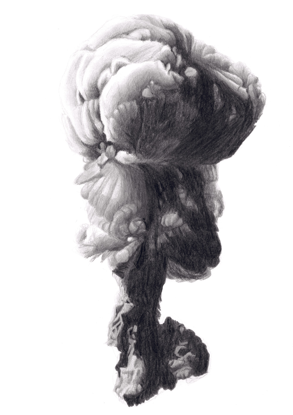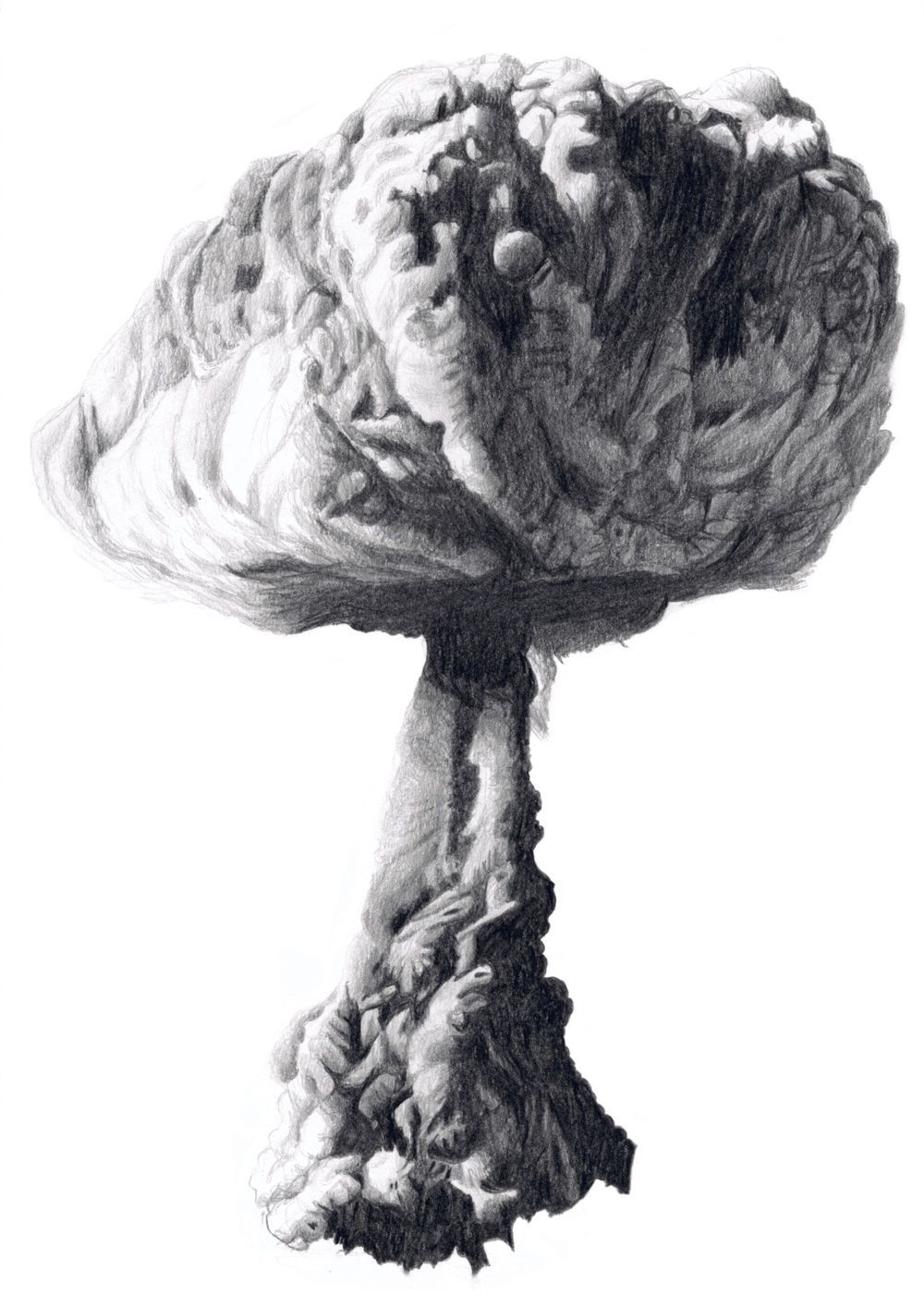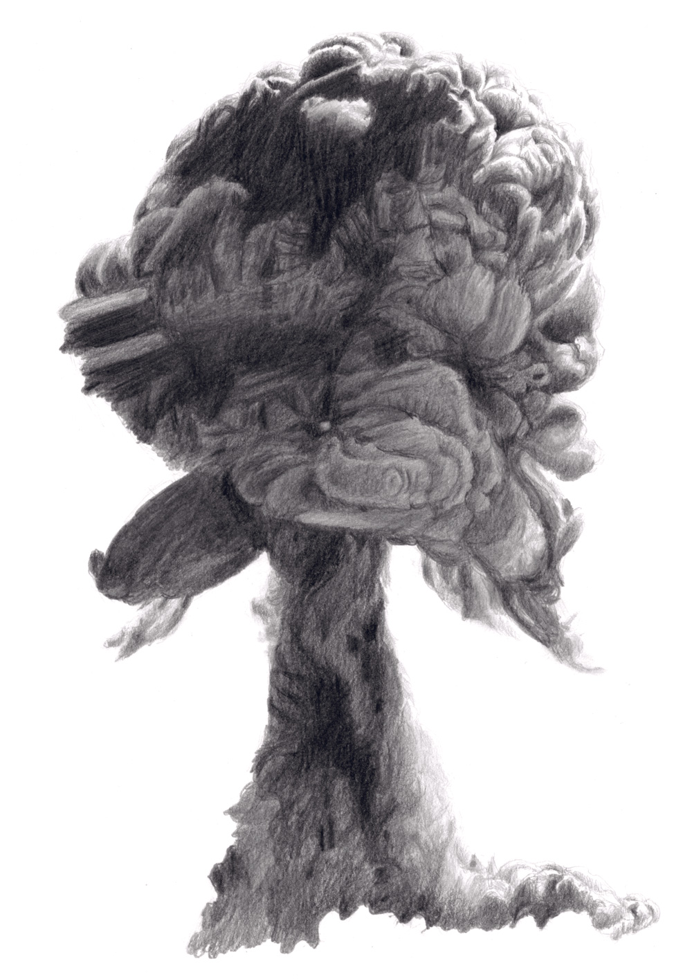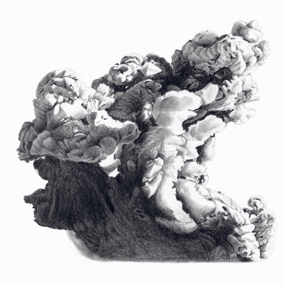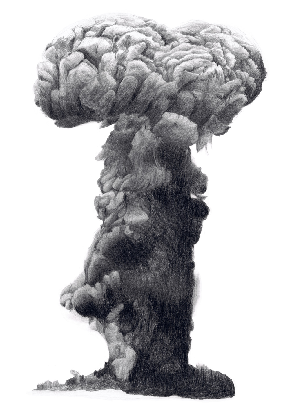 À première vue, la série Atomique de Juliette Vivier pourrait évoquer le résultat d’une solide étude des nuages tant l’exploration semble attentive et délicate. Le geste de l’artiste est assidu, son dessin est minutieux et sensible. Pourtant nous sommes éloignés de l’observation autant ciselée qu’ardente des phénomènes atmosphériques par un John Constable ou un Eugène Boudin. En effet, il ne s’agit pas ici du spectacle des nuées célestes. Ce travail a pour point de départ, non pas les cumulo-nimbus et les rondeurs de leurs courbes, ni les cirrus et leurs traînes mélancoliques, mais la représentation de pyrocumulus, autrement dit de nuages formés par l’explosion d’une bombe atomique.